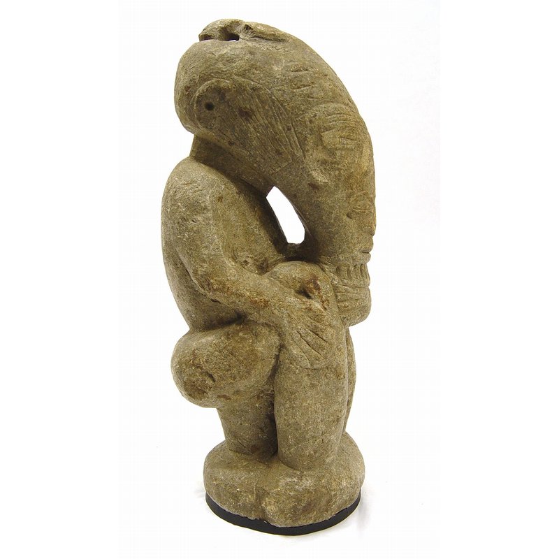 A stone figure, known as nomoli in Mende, carved out of steatite, or soapstone. The age of figures like this one is relatively unknown, however there is evidence to suggest that they predate Portuguese encounters with the coastal areas of Sierra Leone in the 15th and 16th century. They are thought to have originally represented chiefs or group leaders. More recently, however, such figures have been re-discovered and used as rice gods to encourage high yields. Many believe them to be naturally formed, rather than carved. Other names that have been used for figures such as this one are pompta or mahei yafei. This example depicts a seated figure, with an elongated head.