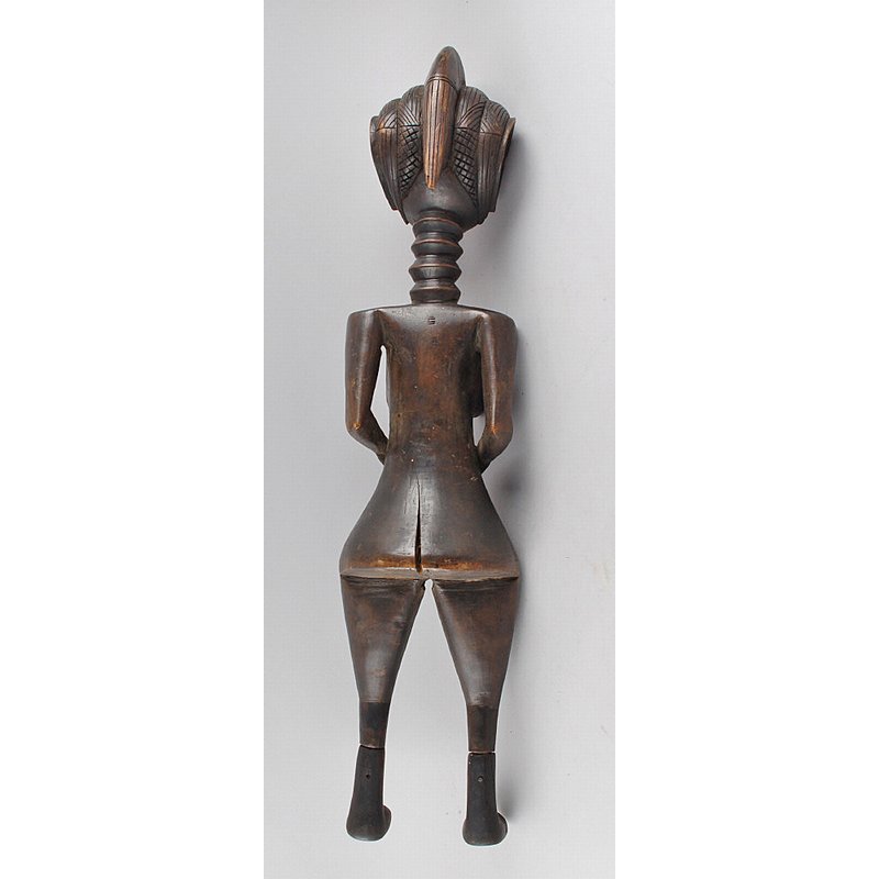 A female figure, carved of wood. She is standing upright, with her hands resting on her stomach. She has a particular hairstyle with a ridge running from the front of her head, to the back, terminating in a point. As with two other examples from the British Museums collections, this ridge is accompanied by two large disc ears, and wide hips (see BM:Af.1925 -17 and BM:Af.1911-225). This example is also wearing boots.