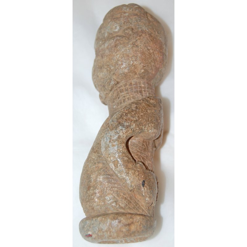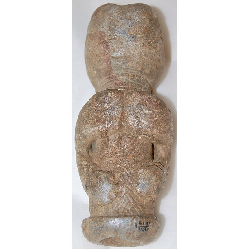 A stone figure, known as nomoli in Mende, carved out of steatite, or soapstone. The age of figures like this one is relatively unknown, however there is evidence to suggest that they predate Portuguese encounters with the coastal areas of Sierra Leone in the 15th and 16th century. They are thought to have originally represented chiefs or group leaders. More recently, however, such figures have been re-discovered and used as rice gods to encourage high yields. Many believe them to be naturally formed, rather than carved. Other names that have been used for figures such as this one are pompta or mahei yafei. This example depicted a human figure, with its hands resting around the back. It has line carved around the neck, and a hole bored into the top of the head. This was originally part of the Wellcome Historical Medical Museum collection and it was acquired by the British Museum in 1954.