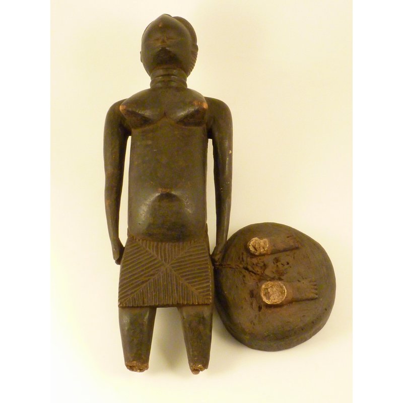 This is a carved wooden female figure from Pujehun. She has a segmented neck and a series of plaited hair ridges; the original Sierra Leone National Museum records suggest it may represent a Bundu-girl .