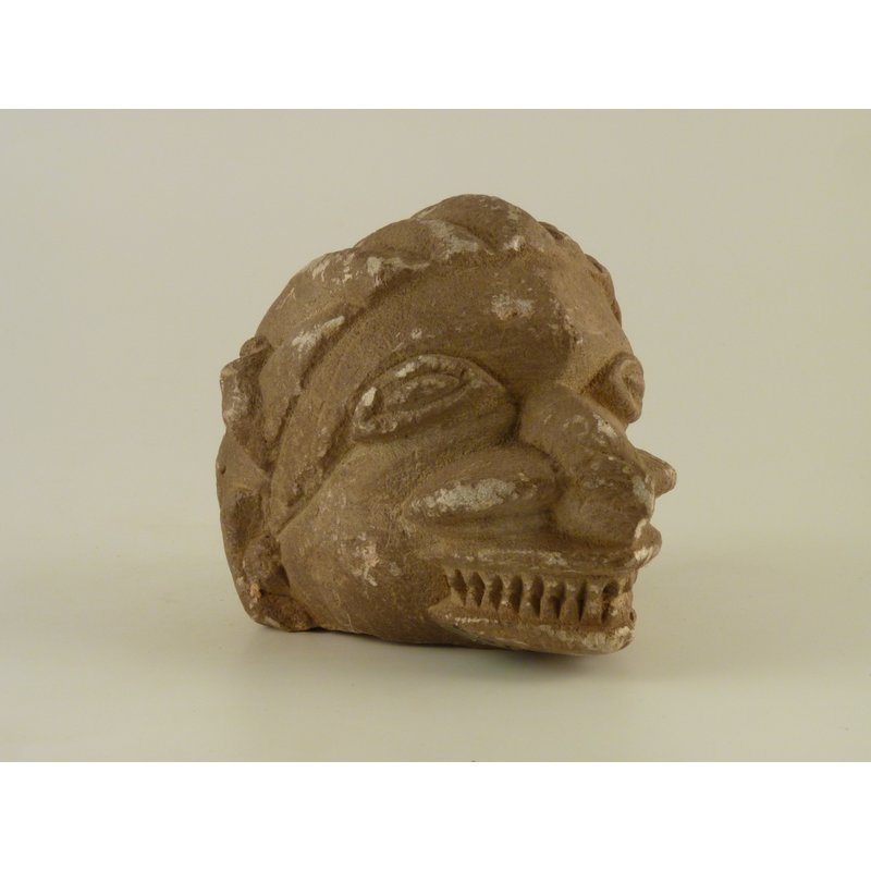A stone figure, known as nomoli in Mende, carved out of steatite, or soapstone. The age of figures like this one is relatively unknown, however there is evidence to suggest that they predate Portuguese encounters with the coastal areas of Sierra Leone in the 15th and 16th century. They are thought to have originally represented chiefs or group leaders. More recently, however, such figures have been re-discovered and used as rice gods to encourage high yields. Many believe them to be naturally formed, rather than carved. Other names that have been used for figures such as this one are pompta or mahei yafei . This example depicts a head, with enlarged nostrils and sharpened teeth. It was found underground on an island in the Sewa River.